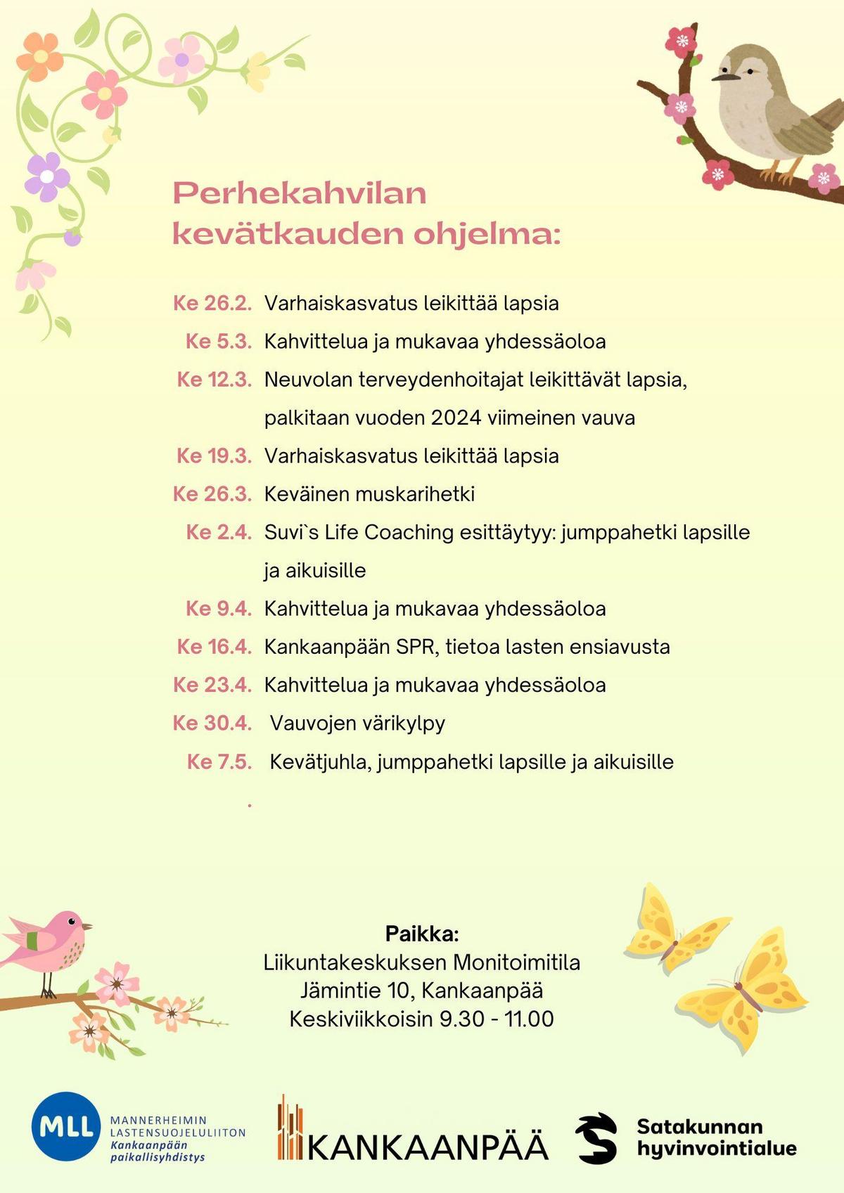 tutustut paikkakunnan muihin, samassa elämäntilanteessa oleviin vanhempiin ja lapset saavat leikkiseuraa. Täällä jutellaan ja kahvitellaan ja touhuillaan. Perhekahvilan toimintaa suunnitellaan yhdessä perhekahvilakävijöiden toiveiden mukaisesti. Perhekahvilat syntyvät vanhempien omasta aloitteesta ja toiminta tapahtuu vapaaehtoisvoimin.